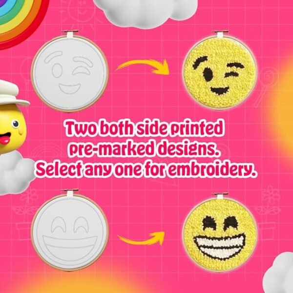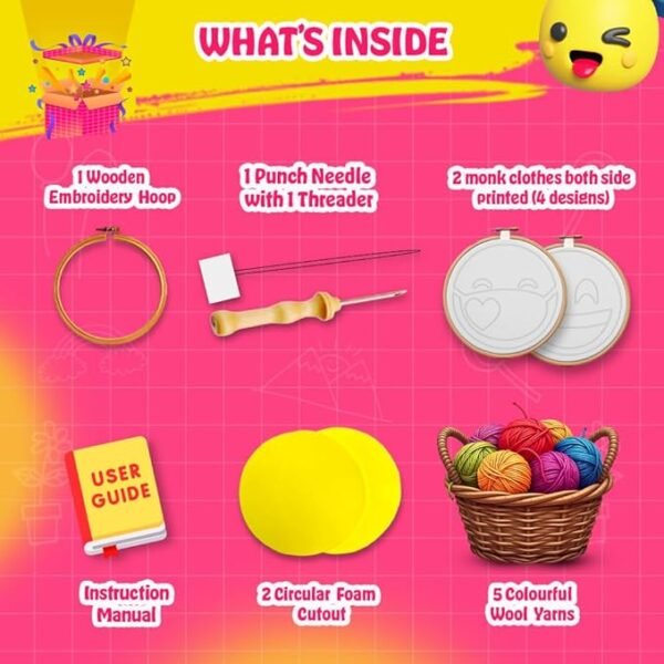 • CONTENT: Our emoji making punch needle embroidery kit includes all the essential materials needed to create two emojis. This comes with two 10*10′ inches pre-marked both side printed monk clothes (4 designs and you have the option to select and make any 2), 7’inches wooden embroidery hoop (1), wooden punch needle & threading wire set (1), colourful yarns required to make emojis (5), circular foam sheet (2), instruction manual (1).